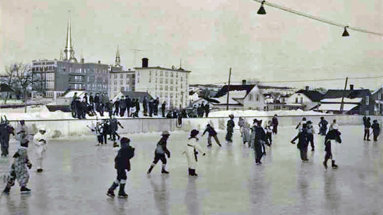 Dehors, à l'arrière de l'édifice, il y avait une grande cour de récréation. En hiver, les Frères aménageaient une patinoire. Ce sont eux qui installaient les bandes et entretenaient la glace avec l'aide des élèves. Cette patinoire était ouverte au public, de sorte que des gens de tout âge pouvaient aller s'y amuser. Voyez une photo probablement prise au cours d'une fin de semaine, car les jeunes sont nombreux à y patiner (photo 6, du 5 mars 1957). De beaux souvenirs, j'étais peut-être parmi ce groupe car j'y allais souvent.